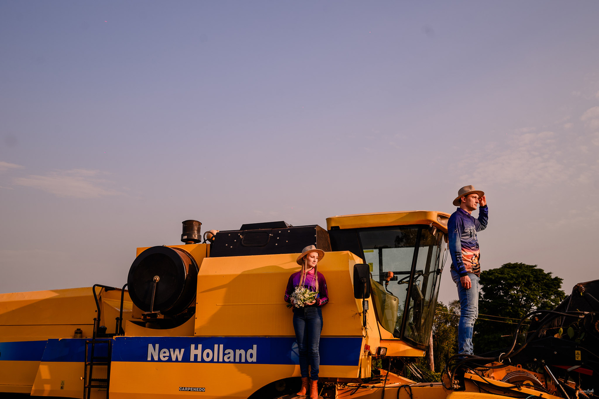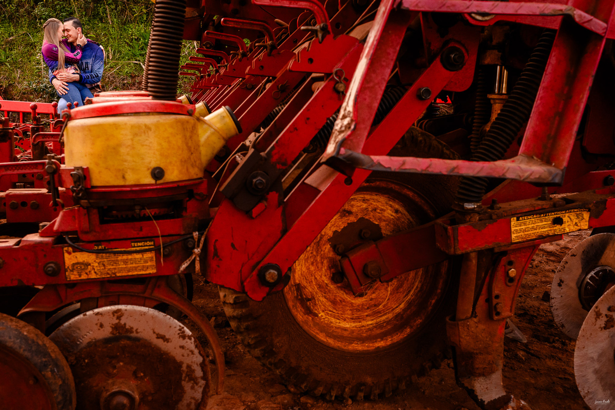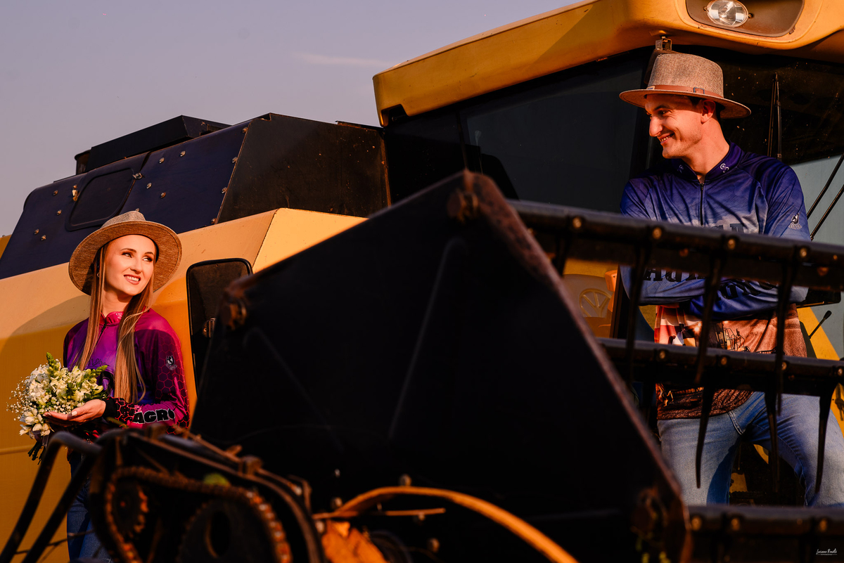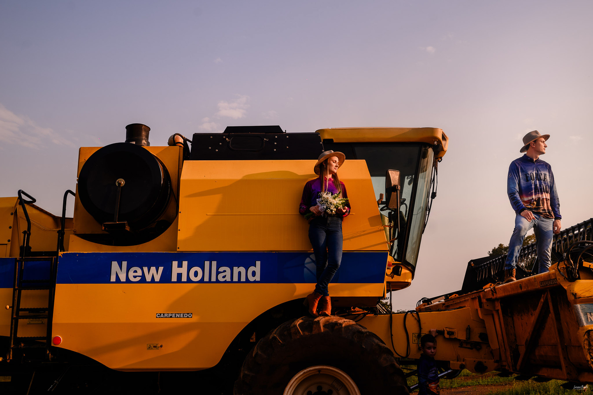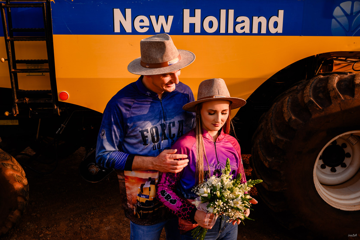 No caso de Diego e Angela, não poderia haver escolha mais especial do que o próprio ambiente em que eles vivem e trabalham, cercados pelos maquinários agrícolas que fazem parte de seu cotidiano. Esses elementos não são apenas parte do trabalho, mas também símbolos do compromisso, da dedicação e da parceria que eles cultivam.