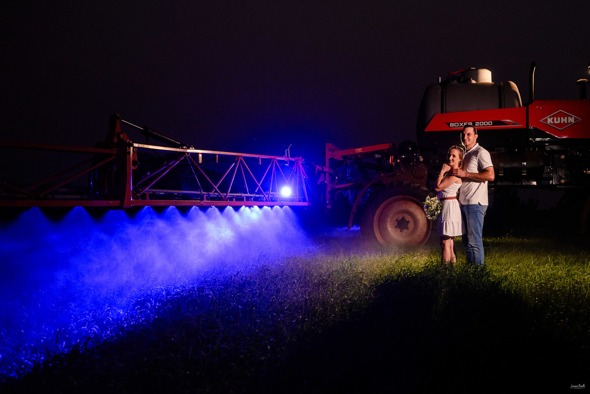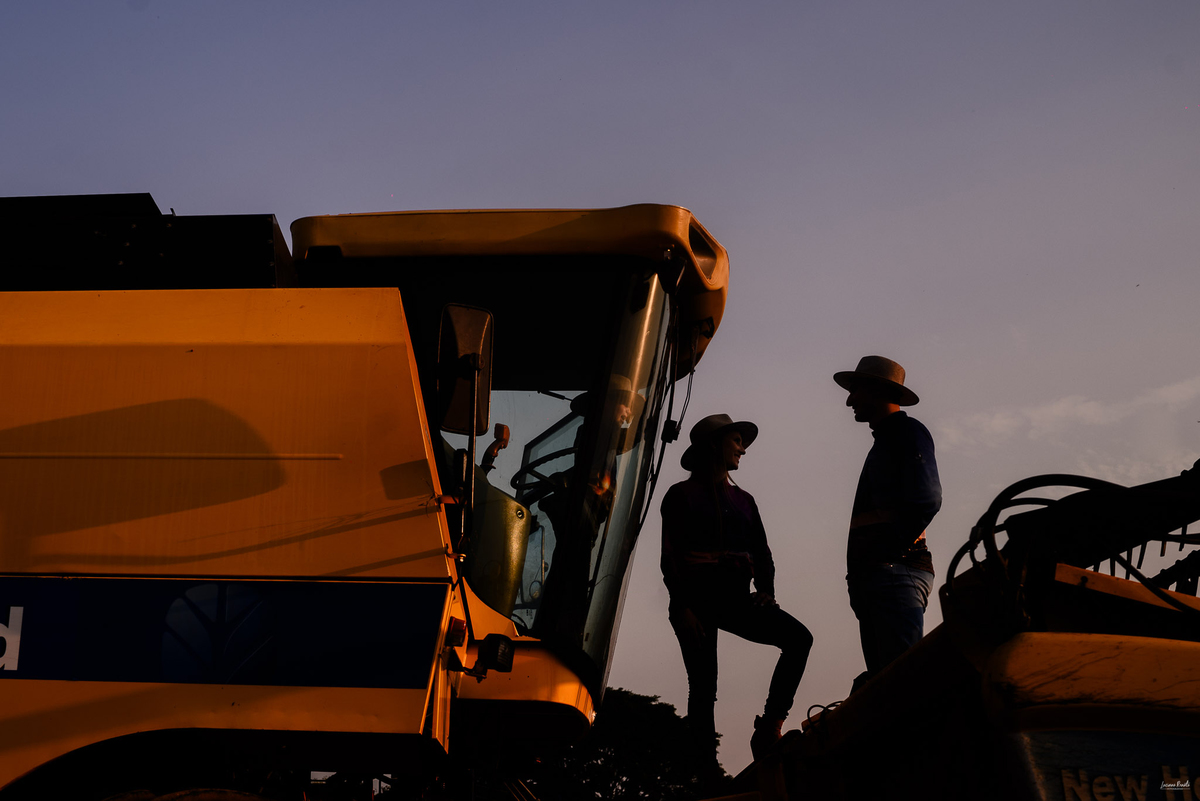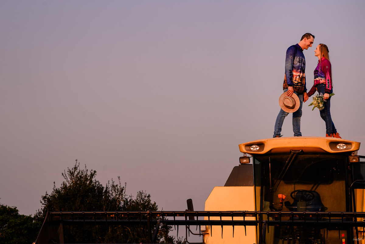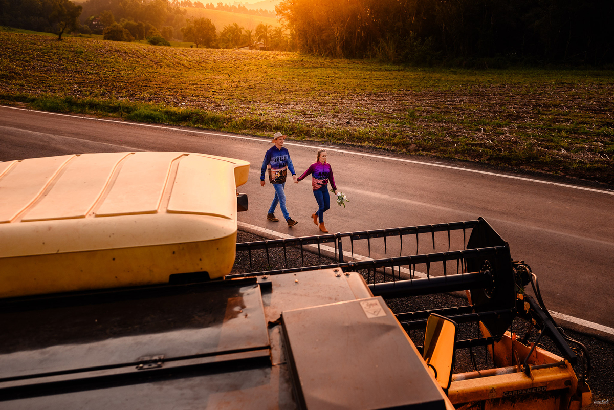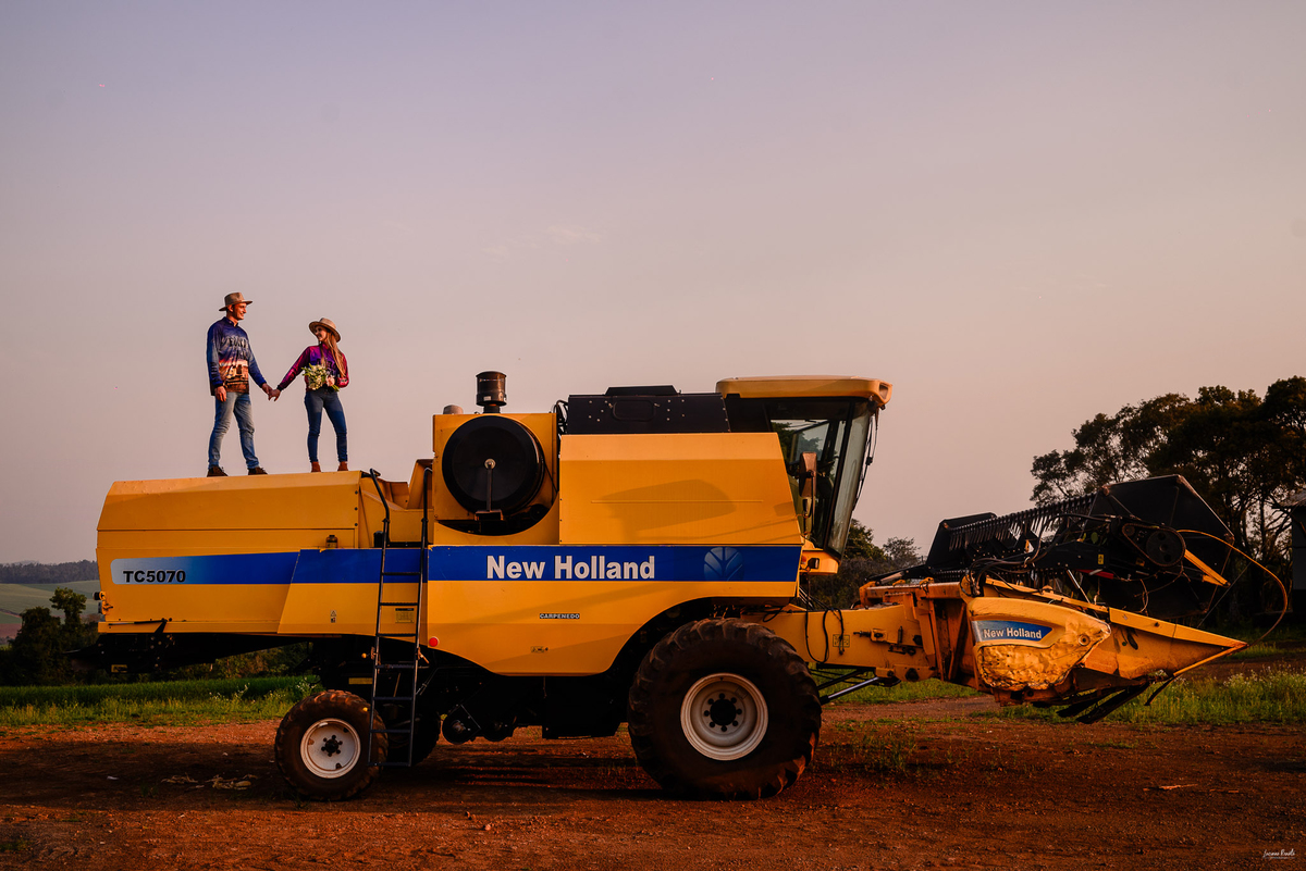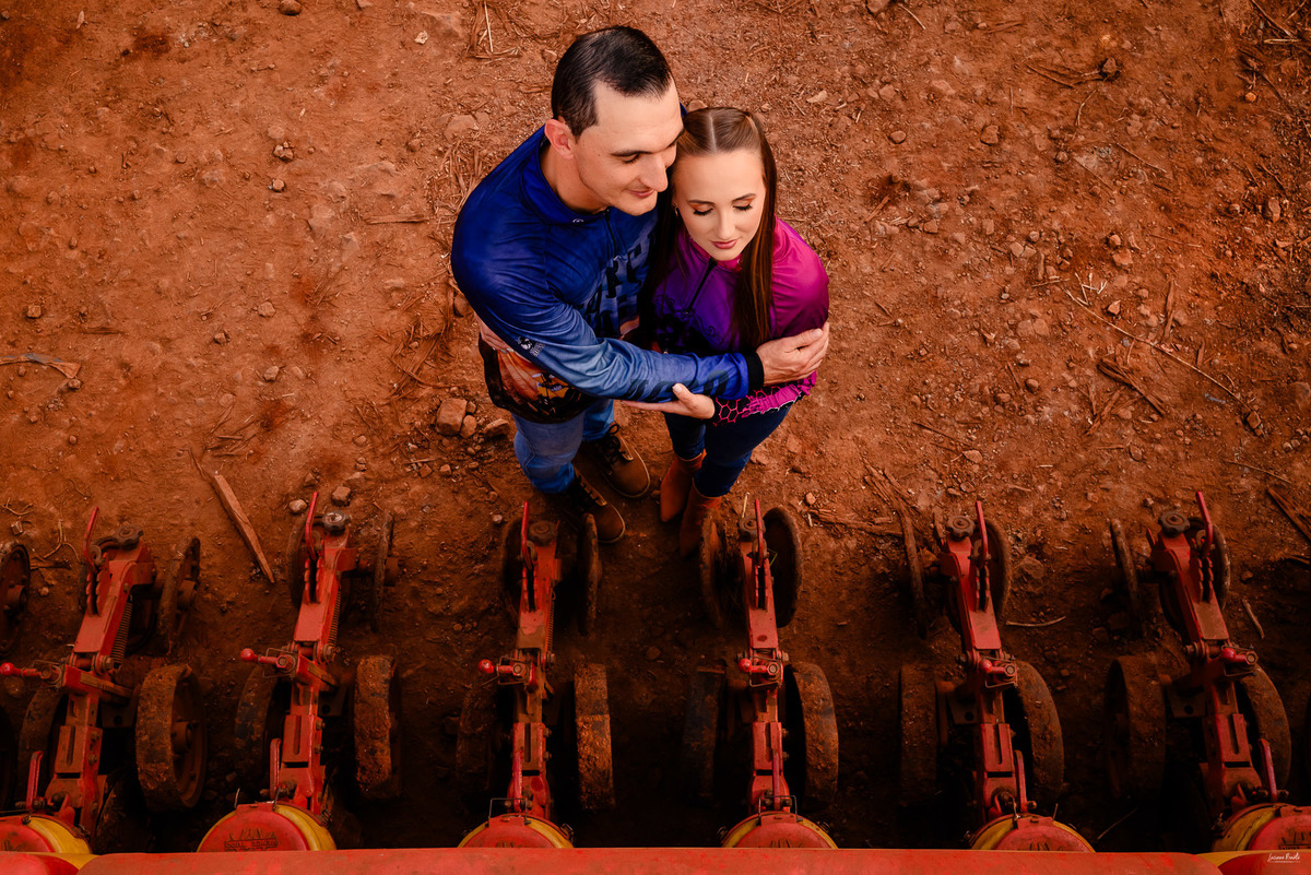 No caso de Diego e Angela, não poderia haver escolha mais especial do que o próprio ambiente em que eles vivem e trabalham, cercados pelos maquinários agrícolas que fazem parte de seu cotidiano. Esses elementos não são apenas parte do trabalho, mas também símbolos do compromisso, da dedicação e da parceria que eles cultivam.